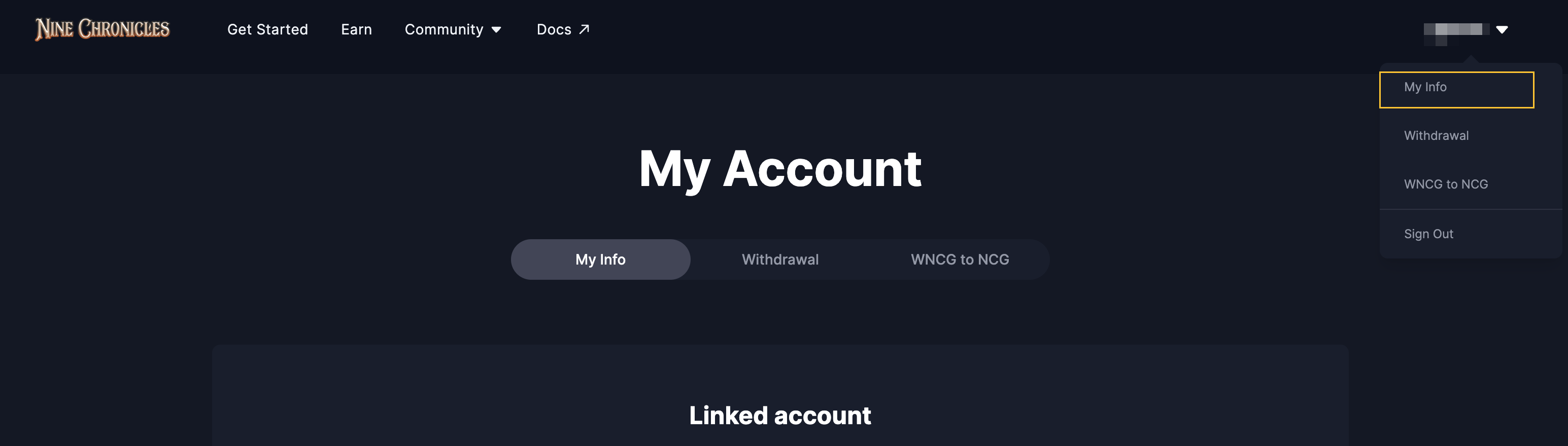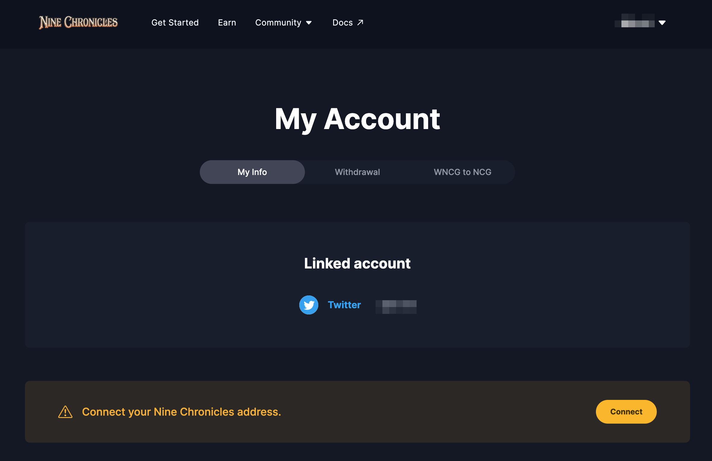 To connect Nine Chronicles address to the portal, you need to visit "My Account > My Info." You can find the button on the menu, after you signed in.