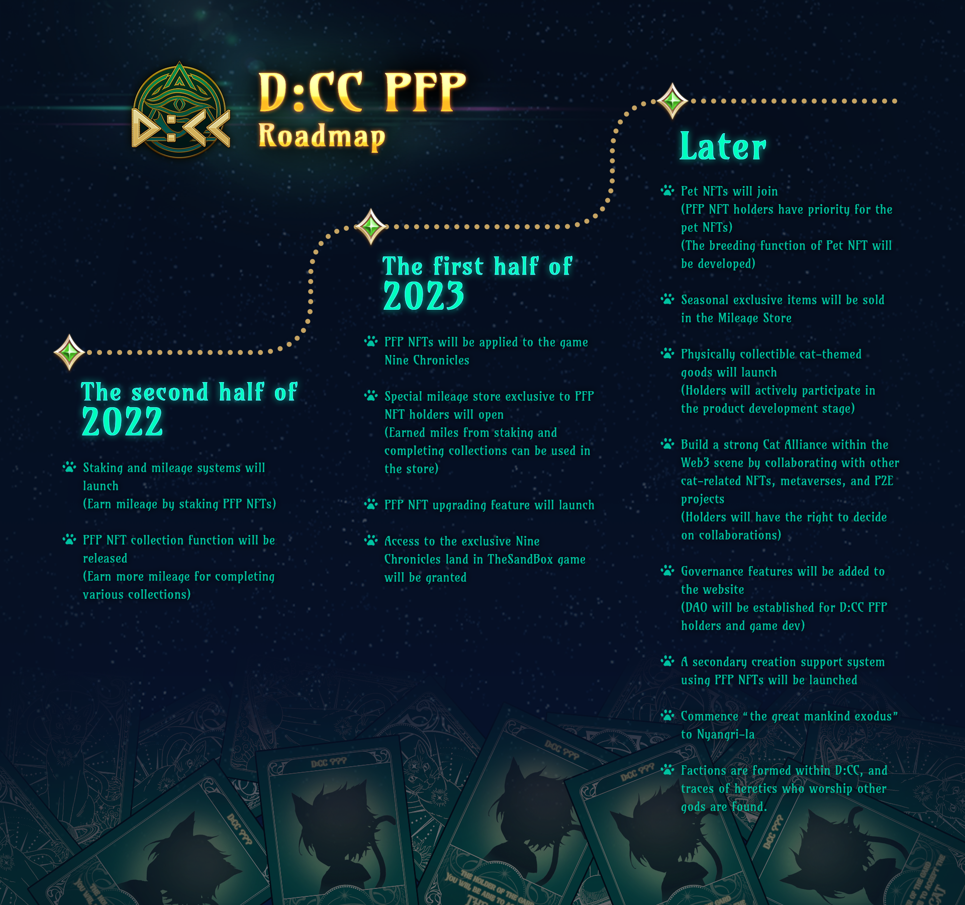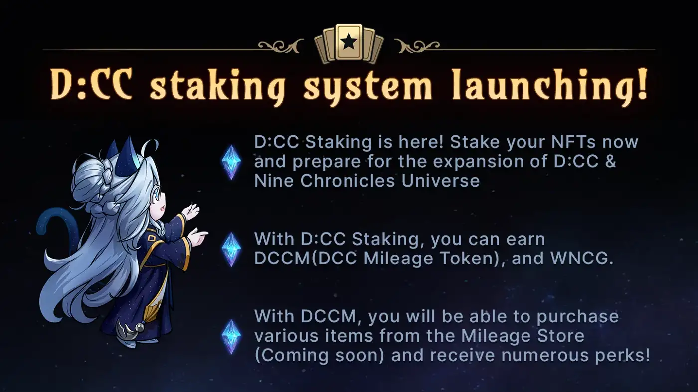 D:CC Staking will be one of the most important features in the D:CC Universe. New mileage with this update (code name: DCCM). This is just one of the new features that D:CC has prepared for you. we will continue to introduce new content and updates that will not only expand the value of D:CC NFT but also, on a greater scale, the value of WNCG, NCG, and Nine Chronicles Universe throughout the Web3 Market.