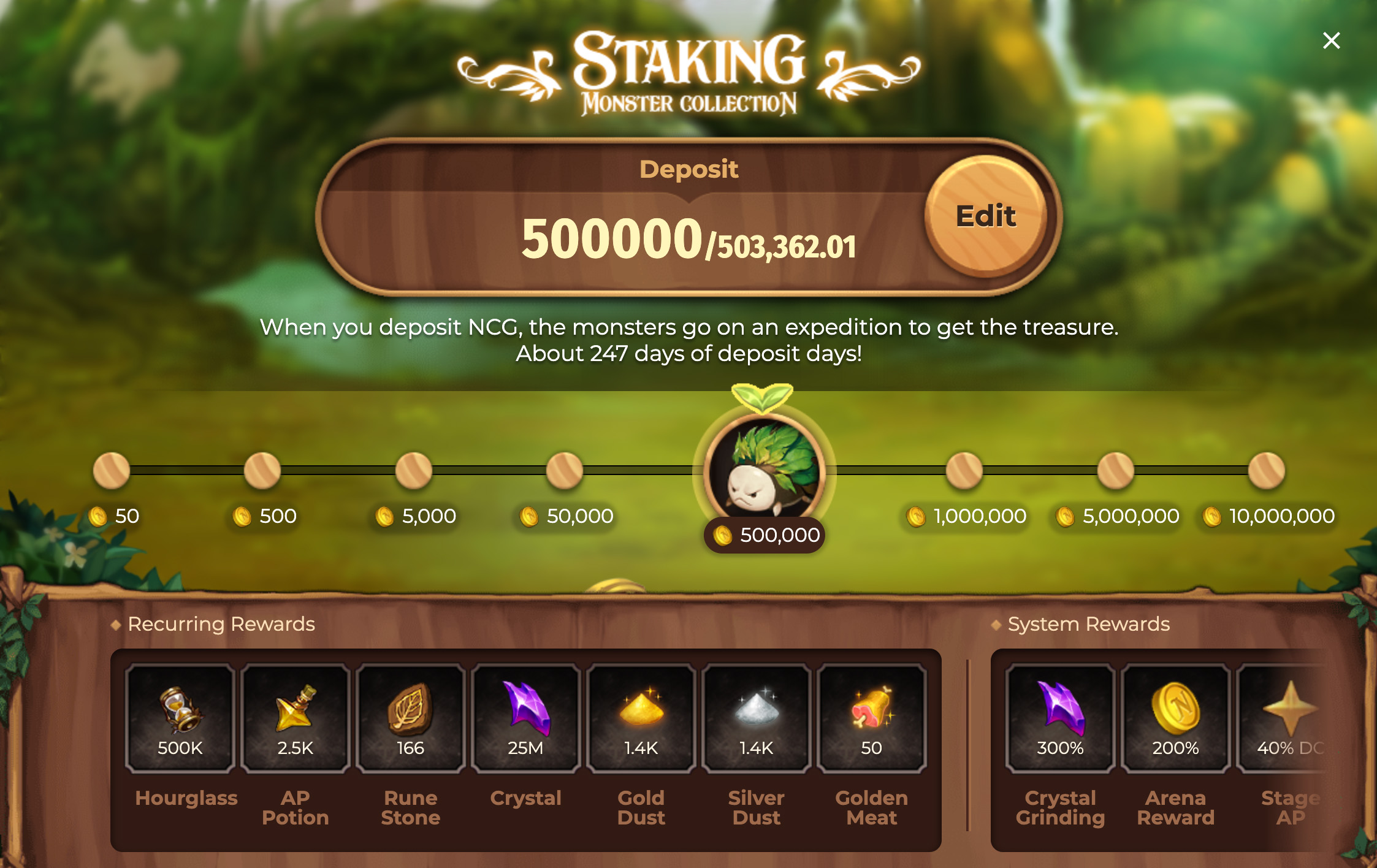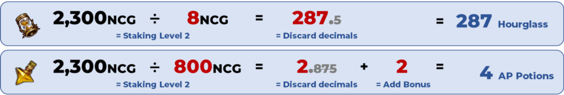 Let’s say you have staked 2,300 NCGs. If the amount of NCG is between two levels, your current level will be the lower of the two levels. In other words, if you have staked 2,300 NCGs, your staking level will be level 2 (between 500 and 5,000 NCGs). Also, you will be receiving 287 Hourglasses and 4 AP Potions. So how to get those numbers? Here’s how.